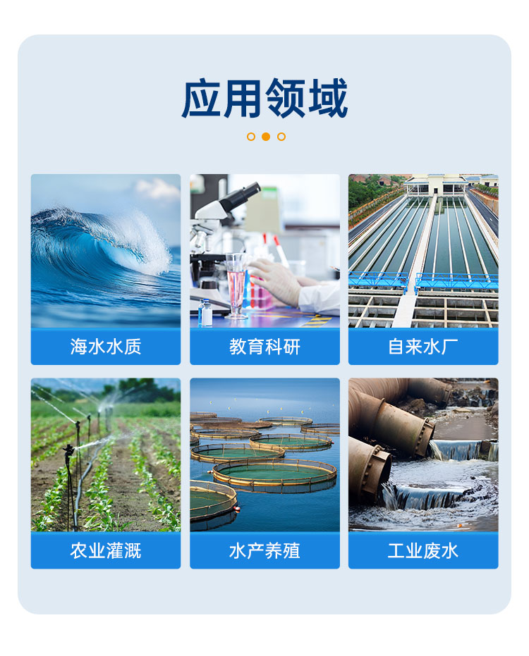 广泛应用于城市供水、食品饮料、环境、医疗、化学、制药、热电、造纸、养殖、生物工程、发酵工艺、纺织印染、石油化工、水处理等领域的水质现场快速检测。